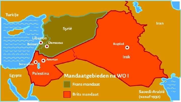 Einde van het Rijk Tijdens WOI vocht Ottomaanse Rijk aan de kant van Duitsers. Na de oorlog moet het rijk groot deel van het grondgebied afstaan. Syrië en Libanon kwamen onder Frans bestuur Irak en Palestina onder Brits bestuur Het werden mandaatgebieden. Het gebied van het huidige Turkije werd verdeeld. Onder leiding van Atatürk vochten Turken voor onafhankelijkheid.