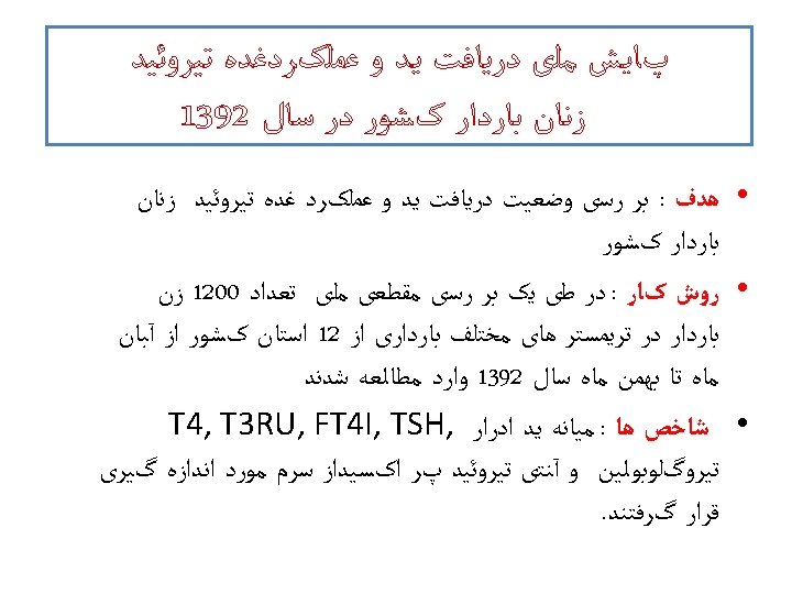 Mean ±SD age of the cohort : 27 ± 7. 2 years. Mean ±SD gestational age: 20. 7 ± 10. 0 weeks. Min. Max. ﻧﺘﺎﻳﺞ کﻠی UIE (µg /L) ( ) ﻣیﺎﻧﻪ یﺪ ﺍﺩﺭﺍﺭ T 4 (µg/dl) TSH m. IU/L 20 4. 92 0. 01 Preliminary : 400 Results 23. 92 Mean Median 114 87. 3 14. 05 11. 19 2. 20 10. 88 1. 95