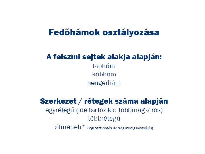 HÁMSZÖVET (tela epithelialis) • Szorosan egymás mellett helyezkednek el és speciális sejtkapcsoló molekulákkal kapcsolódnak egymáshoz. • Funkcionális és morfológiai polaritással rendelkeznek, azaz különböző funkciók köthetők a három különböző sejtfelszínhez: apikális, laterális, bazális. • A bazális sejtfelszín az alatta található membrana basalishoz kötött. • Az epithelium szelektív barriert képez a külvilág és a hám alatti kötőszövet között. Segíti vagy gátolja egyes anyagok transzportját. • • A hámszövetek osztályozása figyelembe veszi a sejtrétegek számát és a felszíni sejtek alakját. • • A hámszövetben nem találunk ereket (avaszkuláris).