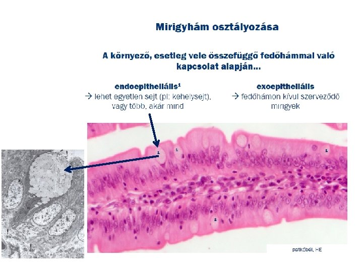 UROTHELIUM A felszíni réteg alakja a funkció függvényében változni képes. Feszülésnek és kémiai igénybevételnek kitett szervek nyálkahártyáját képezi (húgyhólyag, húgyvezeték). A sejtek egymáson elcsúszhatnak, ezért a szerv falának megnyúlásától függ a megjelenő rétegek száma. Feszülő állapotban kevesebb sejtréteg látható, mint a relaxáltban. Azonosításában segít, hogy a felszín alatti sejtmagok kerekdedebbek és ritkásabban helyezkednek el a mélyebb rétegek magjainál. Sejttípusok: - basalis sejt (henger alakú) - körte alakú sejt - ernyősejt (szokatlanul nagy, több sejtet befed, gyakran többmagvú) Előfordulás: vesemedence, húgyvezeték, húgyhólyag, húgycső kezdeti szakasza