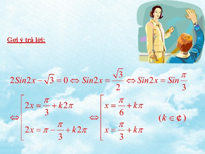 Câu 6 Phương trình có tập nghiệm trên đoạn [0; π] là: A B C D Vì x nên ta tìm được k = 0, k = 1. Suy ra kết quả là đáp án B