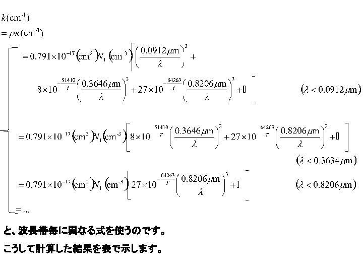 N(H)=0. 9 x. Ntot, N(He)=0. 1 Ntot T: 10000. 0 Pg: 1300. 0 Pe: 419. 600 P-: 0. 0000287 Ne= 3. 039 E+14 NI= 2. 758 E+14 N-= 2. 082 E+07 n 1= 2. 758 E+14 n 2= 7. 977 E+09 n 3= 2. 025 E+09 n 4= 1. 654 E+09 n 5= 1. 816 E+09 lamda log(lmd) HI(b-f) HI(f-f) H-(b-f) H-(f-f) k(Total) 0. 0800 -1. 0969 1. 471 E-03 1. 193 E-26 7. 214 E-11 2. 884 E-12 1. 471 E-03 0. 0911 -1. 0405 2. 172 E-03 1. 761 E-26 8. 050 E-11 3. 838 E-12 2. 172 E-03 0. 0913 -1. 0395 2. 387 E-09 1. 773 E-26 8. 066 E-11 3. 856 E-12 2. 472 E-09 0. 3645 -0. 4383 1. 519 E-07 1. 128 E-24 4. 291 E-10 6. 085 E-11 1. 524 E-07 0. 3647 -0. 4381 5. 326 E-09 1. 130 E-24 4. 294 E-10 6. 091 E-11 5. 816 E-09 0. 6000 -0. 2218 2. 372 E-08 5. 032 E-24 7. 148 E-10 1. 557 E-10 2. 459 E-08 0. 8205 -0. 0859 6. 065 E-08 1. 287 E-23 8. 306 E-10 2. 811 E-10 6. 176 E-08 0. 8207 -0. 0858 1. 267 E-08 1. 288 E-23 8. 307 E-10 2. 812 E-10 1. 379 E-08 1. 0000 0. 0000 2. 293 E-08 2. 330 E-23 7. 888 E-10 4. 093 E-10 2. 413 E-08 1. 4570 0. 1635 7. 092 E-08 7. 205 E-23 2. 191 E-10 8. 421 E-10 7. 198 E-08 1. 4590 0. 1641 1. 882 E-08 7. 235 E-23 2. 161 E-10 8. 443 E-10 1. 988 E-08 2. 0000 0. 3010 4. 847 E-08 1. 864 E-22 1. 000 E-18 1. 558 E-09 5. 002 E-08 2. 5000 0. 3979 9. 466 E-08 3. 640 E-22 1. 000 E-18 2. 414 E-09 9. 707 E-08