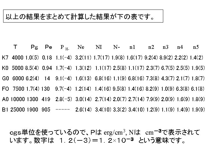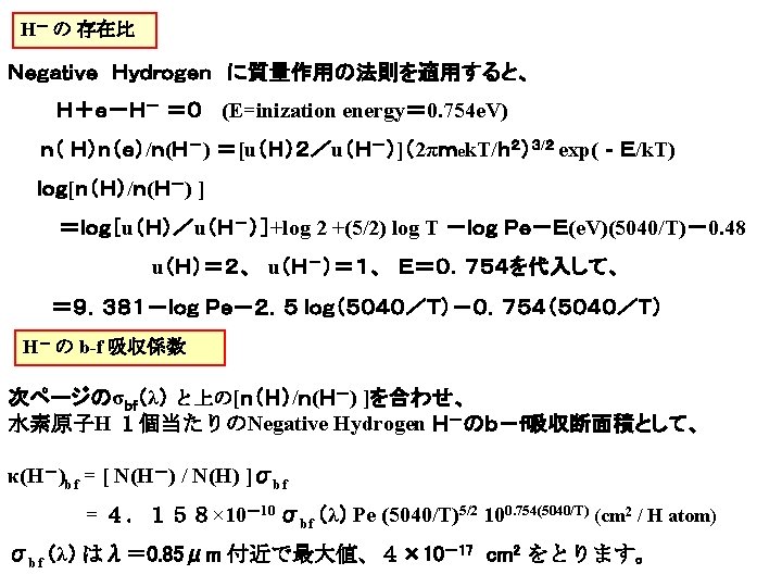 H- の f-f 吸収係数 Belland Berrington 1987 J Phys. B 20, 801. κ(H-)ff =10 -26 Pe 10A (cm 2 / H atom) という近似式が与えられています。 A=fo+f 1 logθ+f 2 log 2θ) fo=-2. 276-1. 6850 logλ+0. 76661 log 2λ-0. 0533464 log 3λ f 1=15. 2827-9. 2846 logλ+1. 99381 log 2λ-0. 142631 log 3λ f 2=-197. 789+190. 266 logλ-67. 9775 log 2λ+10. 6913 log 3λ-0. 625151 log 4λ θ=5040 / T、 λ(in A)