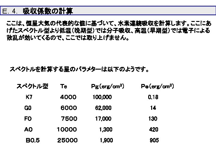 T=6000 K, Pg=6. 2・ 104 erg cm-3 N(He)/H(H)=1/9 G型星大気 log. HIbf log. HIff log. H-bf log. H-ff logk. Total 1. 00 E-07 8. 00 E-08 k(cm-1) 6. 00 E-08 4. 00 E-08 2. 00 E-08 0. 00 E+00 -1. 2 -1 -0. 8 -0. 6 -0. 4 log λ(μm) -0. 2 0. 4