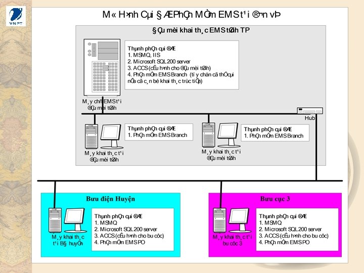 Kết nối mạng EMS • Phương thức kết nối truyền số liệu phần mềm EMS giữa các đơn vị thông qua máy chủ Center tại Post*Net (tương tự phần mềm chuyển tiền CT 2003): - Mạng ĐHSXKD - Mạng Mega. Wan - ISDN hoặc PSTN - Internet (dự phòng) • Phương thức truyền số liệu giữa các đơn vị thành viên VNPT và Công ty Cổ phần CPN : truyền số liệu tập trung từ máy chủ Center • Trang thiết bị : tận dụng toàn bộ trang thiết bị đang sử dụng cho dịch vụ EMS mà Tập đoàn đã đầu tư.
