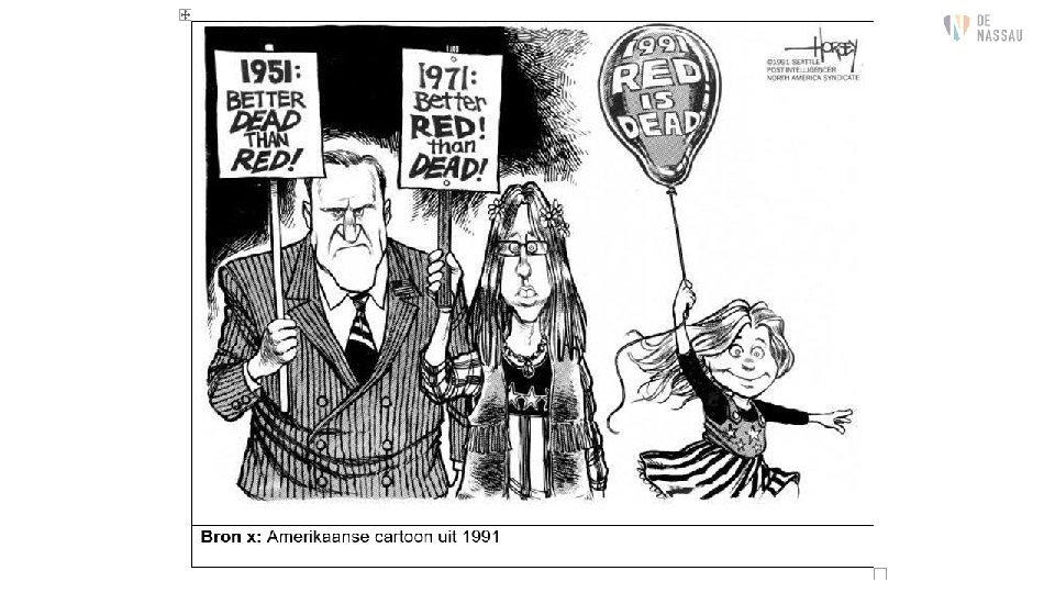 Voorbeeldvraag 1 Gs (met bron) Tijdvak 10 Historische Context Koude Oorlog 1945 - 1991 Gs. Gebruik bron x. Deze cartoon geeft verschillende houdingen van Amerikanen weer tijdens verschillende fases van de Koude Oorlog. 1 p a. Communisme 3 p b. 1951 – Angst voor communisme na gebeurtenissen in 1949/na start Koude Oorlog 1971 – Kritiek van een nieuwe generatie (hippie!) op agressieve politiek van de USA (Vietnam!) in de KO. 1991 – Einde Koude Oorlog na Val van de Muur en instorten SU 2 p c. Nee: algemene beschrijving. Hij kiest geen kant. 4 p Vakoverstijgende vaardigheden SE-CE Gs-KUA-MAW