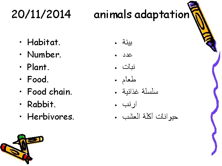 1 o/11/2014 animals adaptations 1. 2. 3. 4. 5. 6. 7. 8. The polar bear. ﺍﻟﺪﺏ ﺍﻟﻘﻄﺒﻰ Snow. ﺍﻟﺜﻠﺞ Covered. ﻳﻐﻄﻰ Warm. ﻳﺪﻓىﺀ Hunted. ﻳﺼﻄﺎﺩ Rabbits. ﺍﺭﺍﻧﺐ Ears. ﺍﺫﻥ Hear. ﻳﺴﻤﻊ