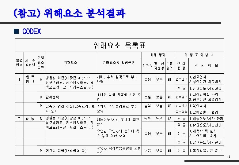 ■ Preliminary Hazard Analysis의 "Classic Risk Level Matrix" 인체 영향성 Human Significance 생 가 능 성 Likelihood of occurrence 발 A 9 13 15 B 7 11 14 C 5 10 12 D 3 6 8 E 1 2 4 1 점 2 점 3 점 심 각 성 Severity 14