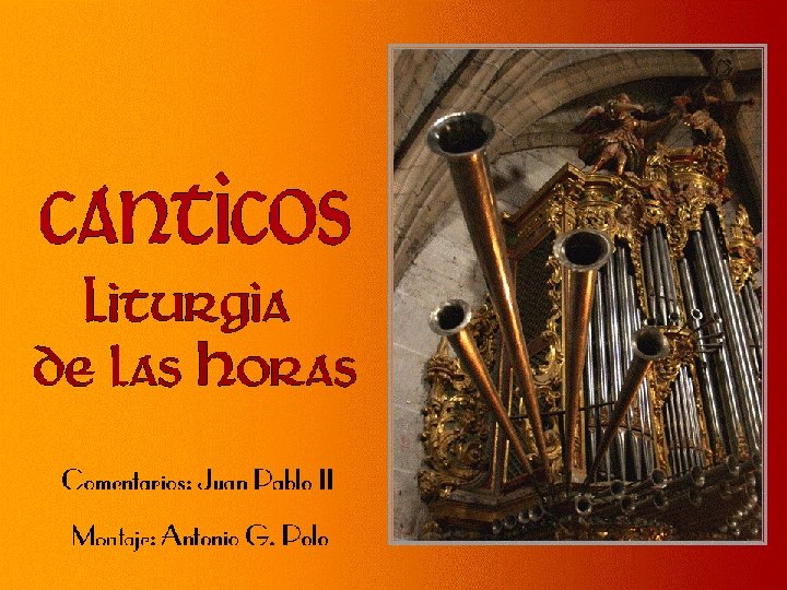 Los comentarios a cada Cántico están tomados de las catequesis de Juan Pablo II en sus audiencias de los miércoles, en Roma. La música corresponde a distintos autores de los ss. XVI y XVII. Tanto las imágenes como la música las encontré en Internet. Este trabajo lo encontraréis en breve en la Web de la Diócesis de Almería http: //www. diocesisalmeria. es/ Espero que todo esto colabore a una oración de pueblo unido que canta y alaba a su Señor. Almería, noviembre 2010