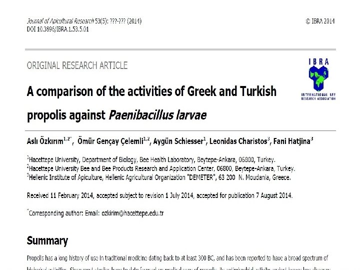 Makale • A. Özkök, K. Sorkun, B. D’Arcy, "Sugar Analysis of Pine Honey from Muğla Region using HPLC" , Mellifera, 14, 27 -28, 27 -32, 2014. • Sorkun, K. , Çelemli, G. Ö. , Özenirler, Ç. , Bayram E. N. , Güzel, F. 2014, Palynological Investigation Of Honey Produced In Ardahan-Turkey, Bee World, 91; 3, 80 -83. • Özkırım A. , Gençay Çelemli Ö. , Schiesser A. , Charistos L. , Hatjina F. , 2014, A comparison of the activities of Greek and Turkish propolis against Paenibacillus larvae, Journal of Apicultural Research 53(5): 528536 (SCI).