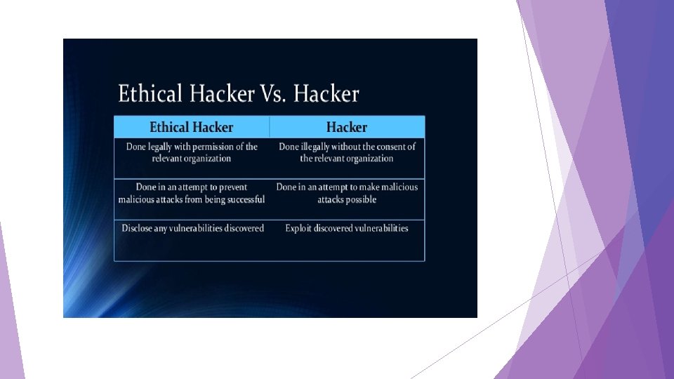 Hacking and ethical hacking: v Hacker • Access computer system or network without authorization. • Breaks the law. v Ethical Hacker • Performs most of the same activities but with owner’s permission. • Employed by companies to perform Penetration Tests.