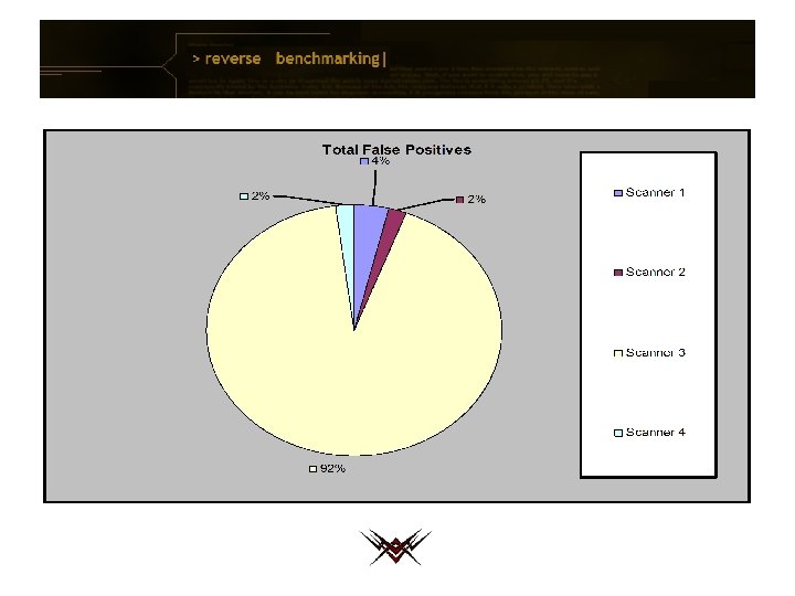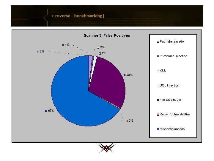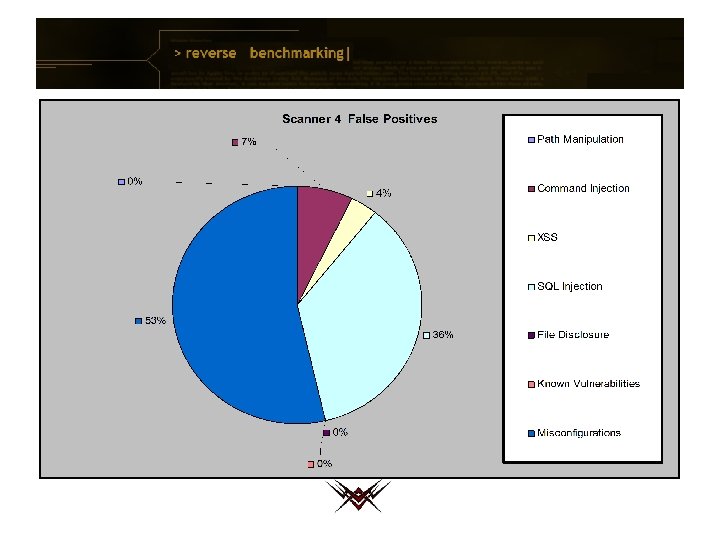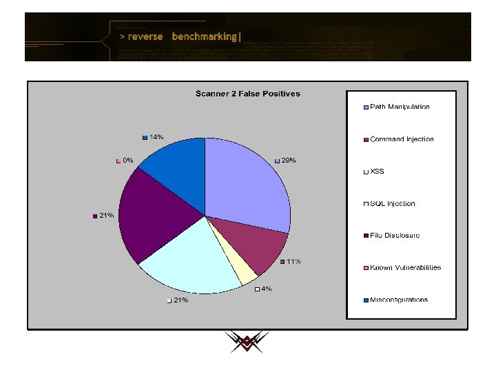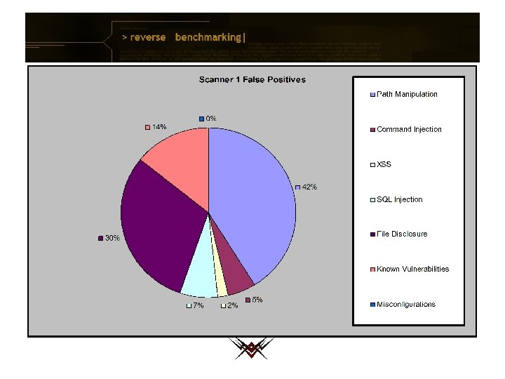 What is Reverse Benchmarking? • • • q q q It’s a type of passive Reverse Engineering. Its Designed to Kick a Scanner’s Ass. TM Causes Massive False Positives Facilitates an understanding vulnerability detection methods Think of it as Detection Logic Fuzzing Exposes poor coding, faulty detection logic Reveals Security Testing design flaws Confuses Stateless Testing Mechanisms