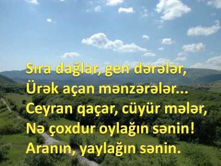 Dağlarının başı qardır, Ağ örpəyin buludlardır. Böyük bir keçmişin vardır. Bilinməyir yaşın sənin, Nələr çəkmiş başın sənin. Düşdün uğursuz dillərə, Nəs aylara, nəs illərə. Nəsillərdən nəsillərə, Keçən bir şöhrətin vardır. Oğlun, qızın bəxtiyardır…