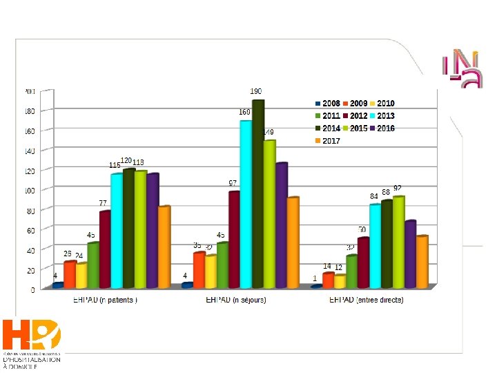 les difficultés - initiales: - “intrusion”, sentiment d’incompétence des EHPAD - craintes directions d’EHPAD (perte de l’étiquette « médicalisé » , coût ? « paperasses » , conflit entre équipes…) - à long terme - contact régulier entre IDE-AS HAD / EHPAD - turn over des médecins Co EHPAD, EPHAD non pourvus… - organisation pratique et logistique (stockage produits, gaz, horaires des tournées, …) - former le personnel de nuit à appeler l’HAD avant tout autre intervenant
