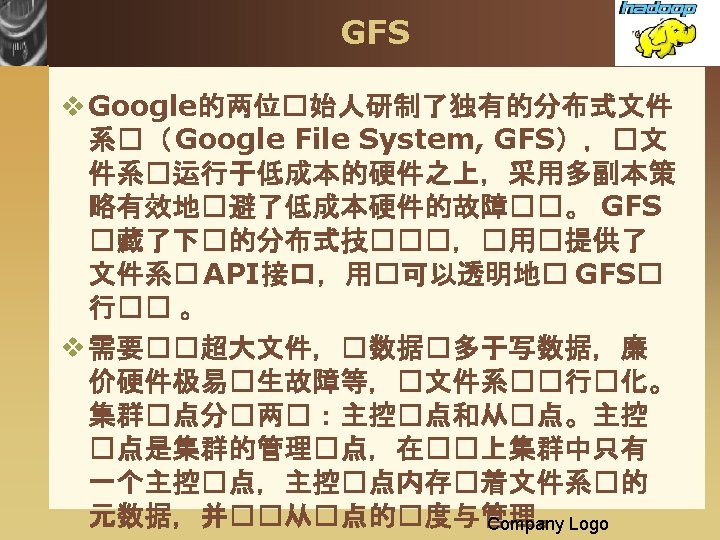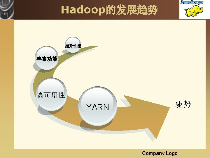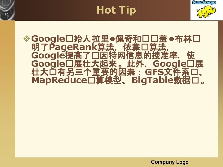 目录 1 Hadoop项目起源 2 Hadoop的由来 3 Hadoop核心组件及相关项目 4 Hadoop的版本衍化 5 Hadoop的发展趋势 Company Logo