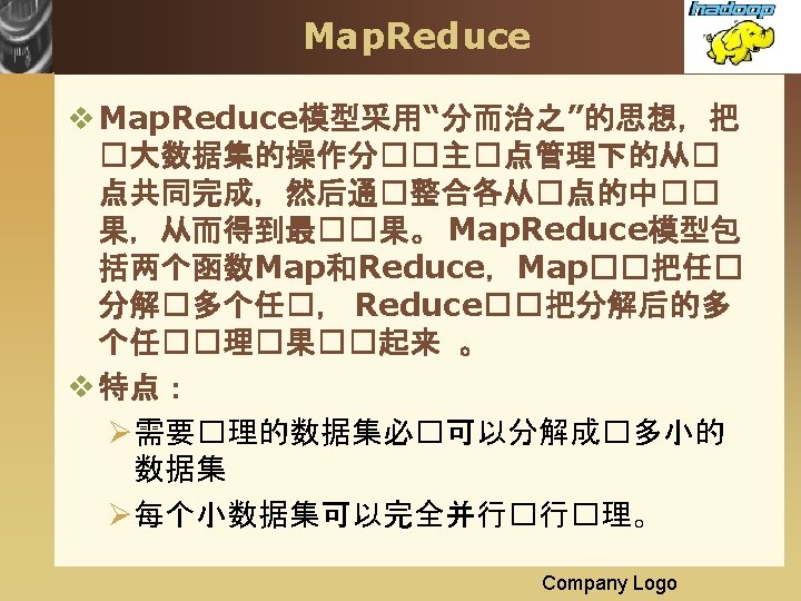 Hadoop核心组件 Hadoop Common模� HDFS Map. Reduce YARN Company Logo
