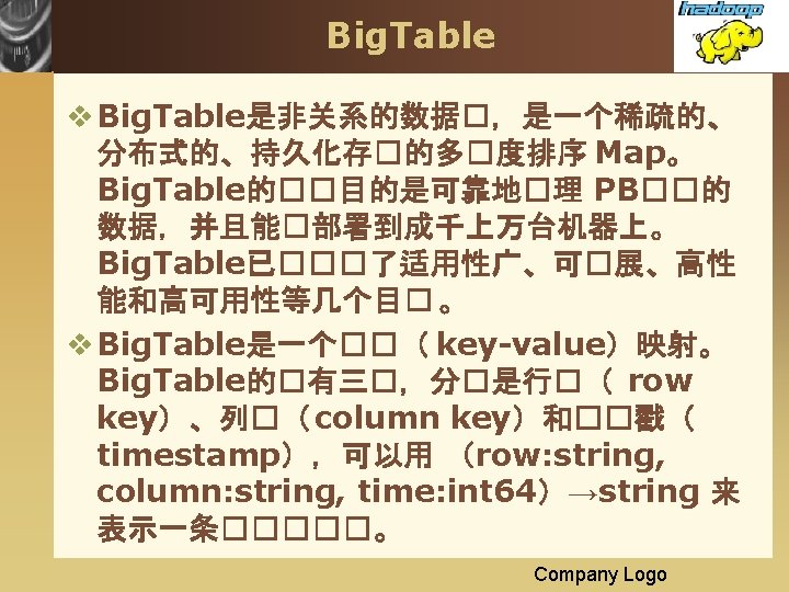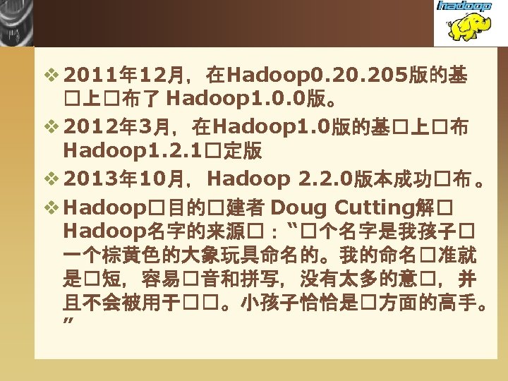 Hadoop的由来 v 2003年,Google�表�文 《The Google File System》 v 2004年Google�表�文 《Map. Reduce: Simplified Data Processing on Large Clusters》 v 2005年在Nutch上使用Map. Reduce和 NDFS v 2006年,Apache Hadoop�目正式 启� v 2007年,百度、中移�使用 Hadoop v 2008年,Hadoop成� Apache���目
