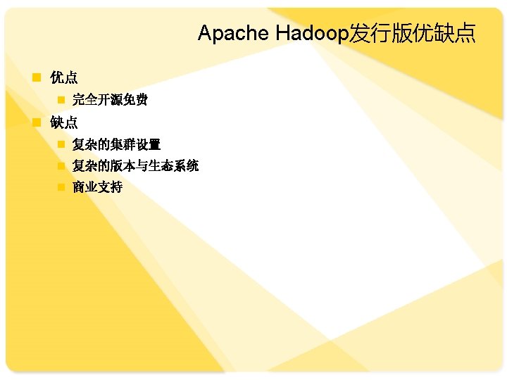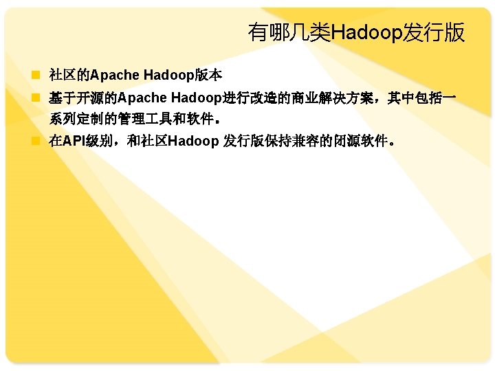 Hadoop发行版本 发行方 Apache Hadoop 社区 CDH Cloudera Hortonworks Data Platform (HDP) Hortonworks Map. R Technologies Pivotal HD EMC Info. Sphere Big. Insights IBM Fusion. Insight Hadoop 华为 Apache Hadoop Intel 分发版 Intel Windows Azure HDInsight 微软