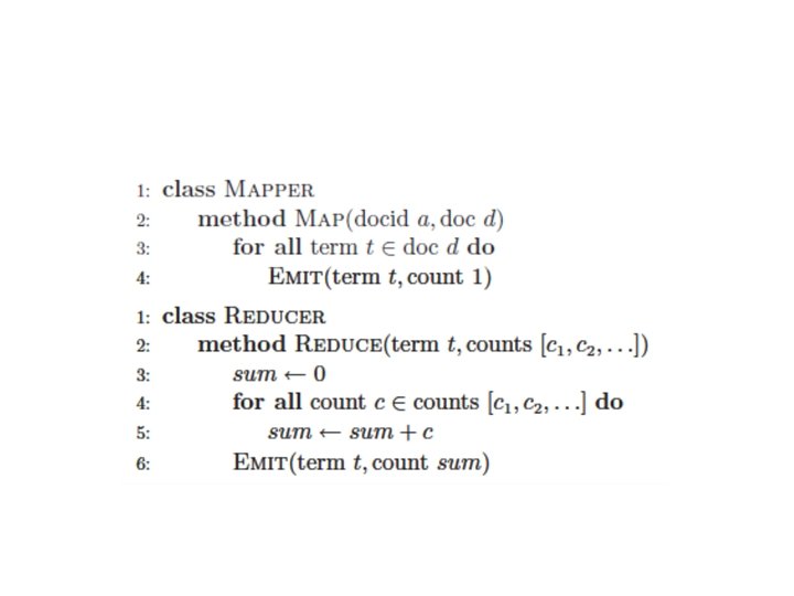 Word Count- Schematic • • • • • In Mappers Shuffle Reducers Out Key freq Key freq key freq Word 1 -Book 1 n 1 Word 1 -Book 1 n 1 Word 1 -Book 2 n 2 Word 1 -Book 2 n 2 Word 1 n 13 Book 1 Word 2 -Book 1 n 3 Word 1 -Book 3 n 7 Book 2 Word 2 -Book 2 n 4 Word 1 -Book 4 n 8 Word 3 -Book 1 n 5 Word 3 -Book 2 n 6 Word 2 -Book 1 n 3 Word 2 -Book 2 n 4 Word 2 n 14 Word 2 -Book 3 n 9 Word 1 -Book 3 n 7 Word 2 -Book 4 n 10 Word 1 -Book 4 n 8 Book 3 Word 2 -Book 3 n 9 Book 4 Word 2 -Book 4 n 10 Word 3 -Book 1 n 5 Word 3 -Book 3 n 11 Word 3 -Book 2 n 6 Word 3 n 15 Word 3 -Book 4 n 12 Word 3 -Book 3 n 11 Word 3 -Book 4 n 12 • • Computation: n 13 = (n 1 + n 7 + n 8) n 14 = (n 3 + n 4 + n 9 + n 10) n 15 = (n 5 + n 6 + n 11 + n 12) • •
