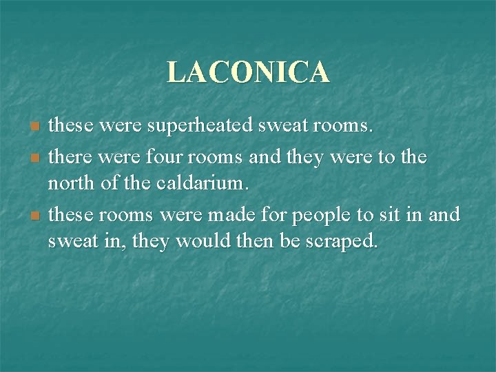 LACONICA n n n these were superheated sweat rooms. there were four rooms and they were to the north of the caldarium. these rooms were made for people to sit in and sweat in, they would then be scraped.