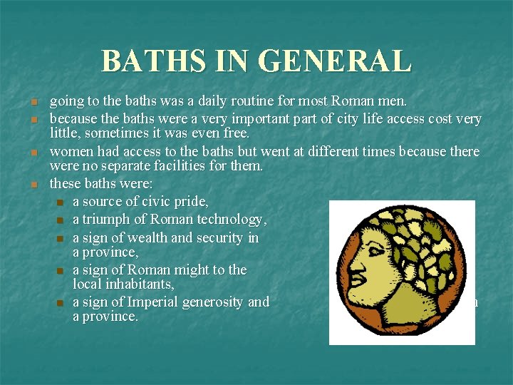 BATHS IN GENERAL n n going to the baths was a daily routine for most Roman men. because the baths were a very important part of city life access cost very little, sometimes it was even free. women had access to the baths but went at different times because there were no separate facilities for them. these baths were: n a source of civic pride, n a triumph of Roman technology, n a sign of wealth and security in a province, n a sign of Roman might to the local inhabitants, n a sign of Imperial generosity and concern in a province.