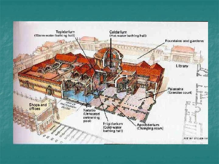 OTHER ROOMS IN THE BATHS PALAESTRA n a vast exercise yard was to the north of the bath complex. NON-WET ROOMS n a further series of chambers run along the western and eastern sides of the complex that may have: n n n libraries, rest areas, maybe even lecture halls.