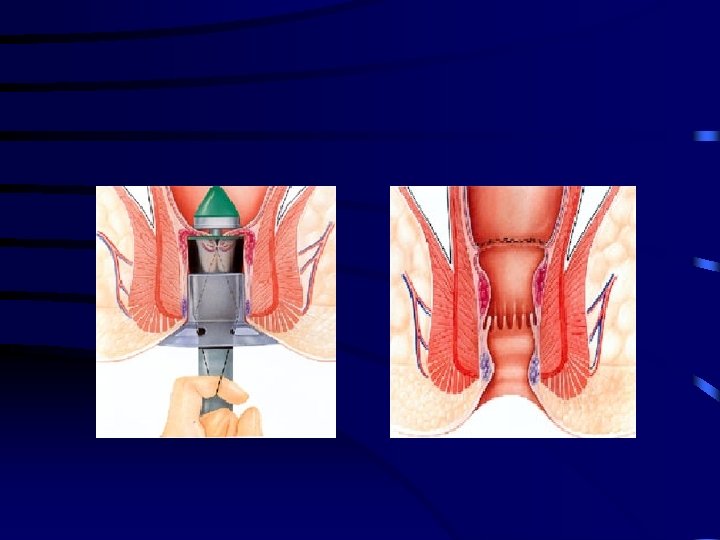 Stapled Haemorrhoidectomy • Circular stapling device excises annulus of rectal mucosa above the pathological rectal mucosa (haemorrhoid) • Interruption of blood supply leads to reduction in size of vascular cushions • Reduction of available rectal mucosa for potential prolapse