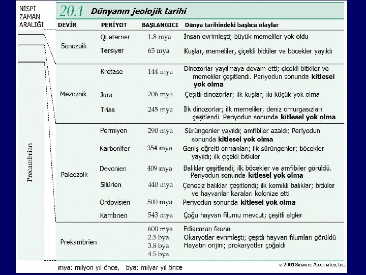 Dünya zaman içinde nasıl değişti? • Dünya üzerindeki yönlenmemiş fiziksel değişimler dereceli soğuma ve kıtaların kaymasına neden olan kuvvetlerdeki zayıflamayı içerir. • Yaşam prekambriyen devrinde başladı (Tablo 1). Şimdiye kadar en eski organizma fosilleri Prekambriyen kayaçlarında bulundu. • Bunlar radyometrik tarihlendirme tekniklerine göre yaklaşık 3. 5 milyar yıl yaşındadır. Bazı paleontologlar ise daha yaşlı kayaçlardaki kimyasal izlere dayanarak ilk canlıların yaklaşık 3. 9 milyar yıl öncesinde ortaya çıktığına inanmaktadır.