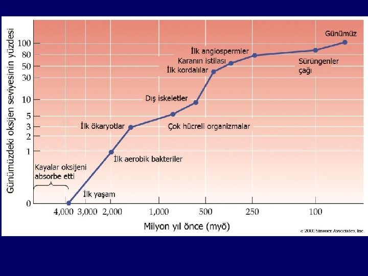 Dünya zaman içinde nasıl değişti? • Atmosferik oksijen yaklaşık 1, 5 milyar önce sabit bir orana ulaşmasına kadar dereceli olarak artmaya devam etti. • O zamandan beri atmosferdeki oksijen oranı aşağı yukarı sabittir, yani fotosentezle üretilen oksijen miktarı ile oksijenli solunumda kullanılan oksijen miktarı birbirini dengelemektedir. • Atmosferik oksijenin artması ökaryotların ve çok hücrelilerin gelişimine imkan verdir.