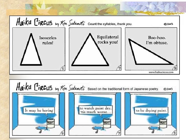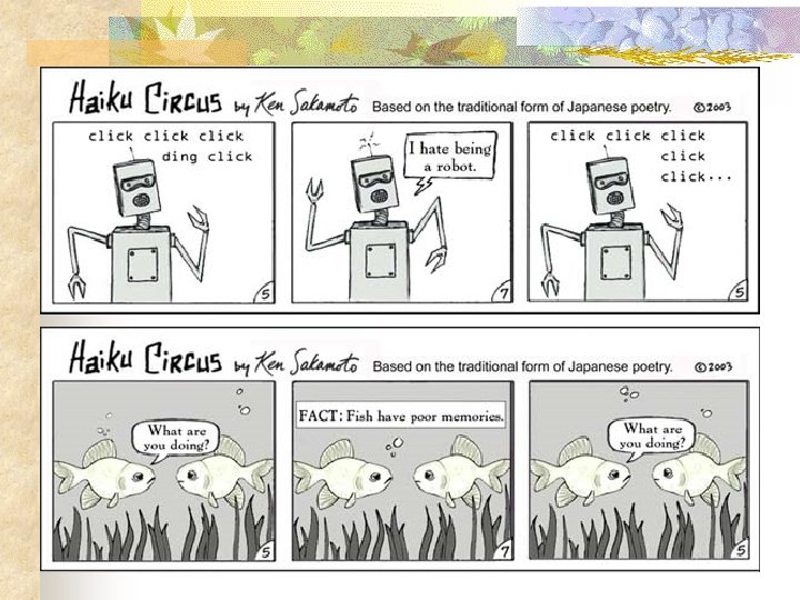 Haiku Comic Strips n Haiku poems create visual images. Some writers choose to write haiku in the form of a comic strip.