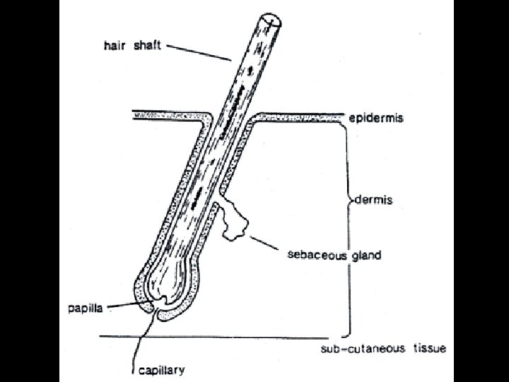 Basic Structure of Hair • A hair grows from the papilla and with the exception of that point of generation is made up of dead, cornified cells. • It consists of a shaft that projects above the skin, and a root that is imbedded in the skin