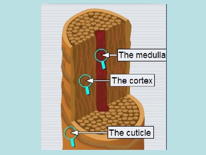 HAIR • Hair is an appendage of the skin that grows out of an organ known as the hair follicle. • The length of a hair extends from its root or bulb embedded in the follicle, continues into a shaft, and terminates at a tip end. • It is the shaft, which is composed of three layers—the cuticle, cortex, and medulla—that is subjected to the most intense examination by the forensic scientist. • FYI: There about 100, 000 scalp hairs on the average person