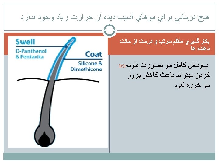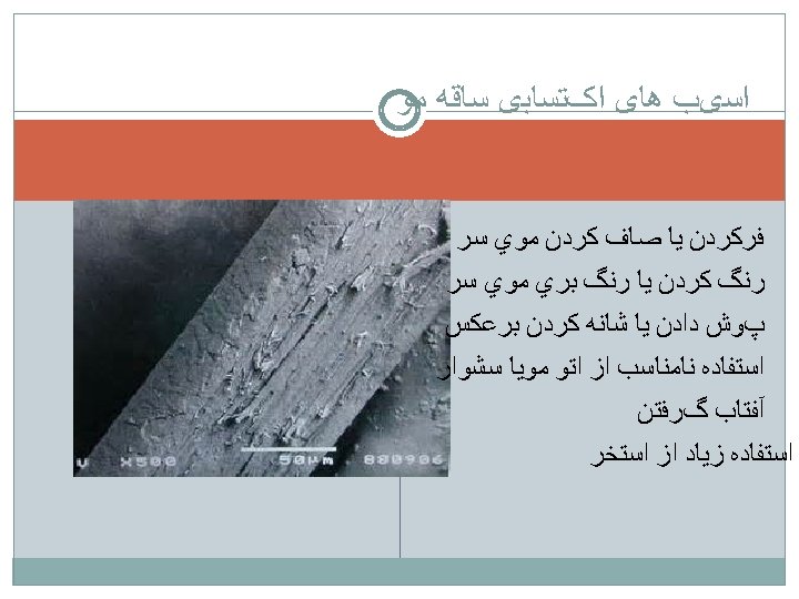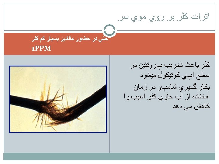 Trichoptilosis - split ends in the hair ( Trichoptilosis) common for dry hair. -occur when the protective layer of the hair, or cuticle, becomes damaged. - It is usually caused by frequent washing, excessive dying, vigorous brushing, overuse of chemicals. KETOCONAZOL SHAMPOO