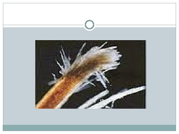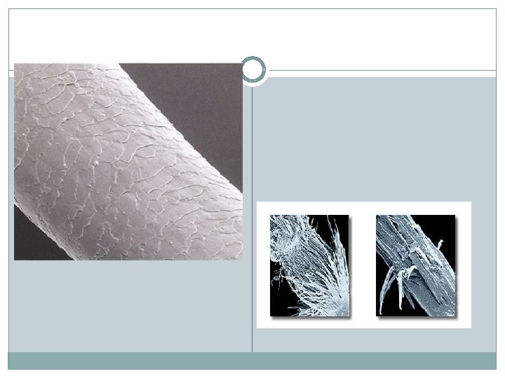 • Hair grows in cycles so the structure of an individual • • hair apparatus varies. Anagen – growing phase (4 to 7 years for scalp hair) Catagen – in between phase (a few weeks) Telogen – resting phase (a few months) Then the new anagen hair shaft starts to germinate within the same follicle, and it pushes out the telogen hair resulting in normal hair shedding or moulting.