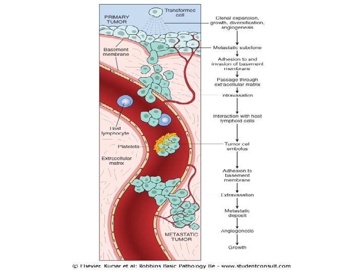 2)Vascular dissemination & homing of tumor cells • Tumor cells binds to leukocytes, this protect them from host defense mechanisms • Tumor cells adhere to vascular endothelium & pass through BM • Site of extravasations & Meyts depends on: -Blood & Lymphatic supply -Organ tropism/adhesion molecules -Some tumors have increase CXcr 4 and its legends is only seen in sites of breast Mets NOT ALL SITES CAN BE PREDICTED