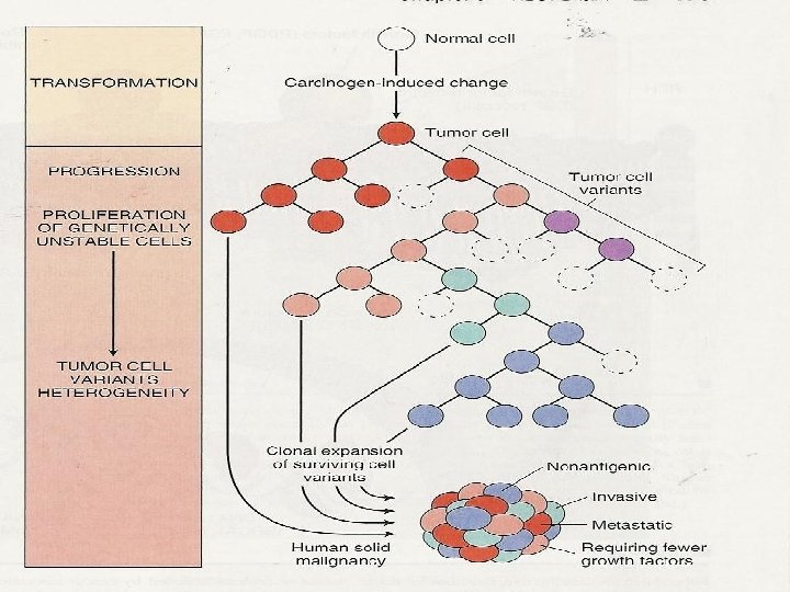 Tumor Progression & Heterogeneity • Tumor progression: means increase aggressiveness & and is acquired occurring in an increasing fashion • Development of new subset of cells that are different in aspects such as invasivness, ability to Mets, hormonal response- Heterogeneous group • Results from multiple mutations occurring independently in different cells subclone of cells that is different