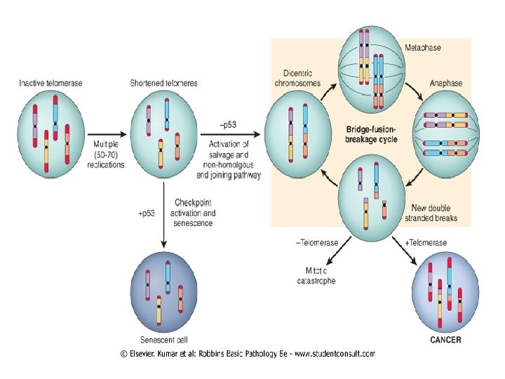 Limitless Replicative Potential • Most normal human cells have a capacity of 60 -70 doubling, after the cell will enter non replicative senescence & result in shortening of telomeres at the end of chromosome & loss of telomeres beyond a certain point will lead to massive chrosomal abnormalities & death • In order to develop tumor, need to maintain cells i. e. avoid cell senescence • This is done by enzyme TOLEMERASE which maintain chromosome length • 85 -95% of cancer have up regulation of enzyme telomerase