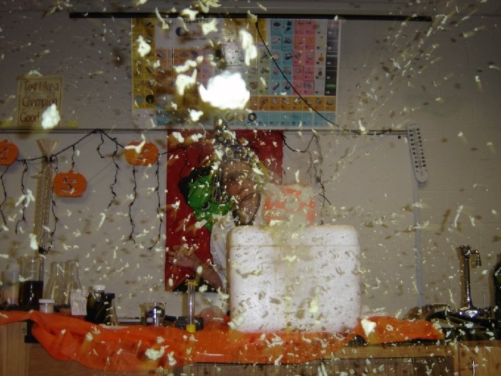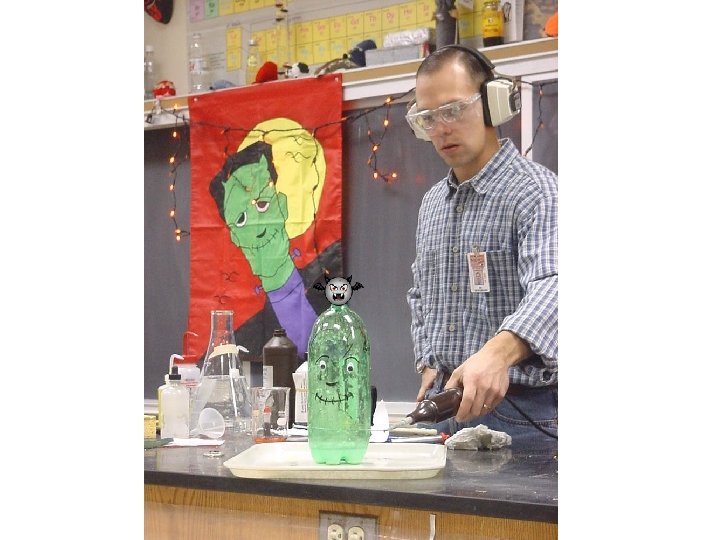 Chemicals to mix ahead of time. Mix 4000 m. L of PVA monomer. Mix 2000 m. L for funnel. mix 1000 m. L of borax + water, Add to 4 squirt bottles with food coloring for cross linking agent. Pick up ¾ block of dry ice from ISU night before Halloween show & bring big Styrofoam cooler. Buffer tabs – mix 500 m. L of each buffer in Erlenmeyer flask Bring from Home Pumpkin lights & streaming down lights Halloween flags of Frankenstein & Haunted House Halloween masks Halloween music (CD, tape and/or internet) plastic cup lid to clean out inside of pumpkins Knife to carve pumpkins (John Bergmann) Clean-Up Gift card for Dan (custodian) $20 sodium thiosulfate to clean up iodine stains