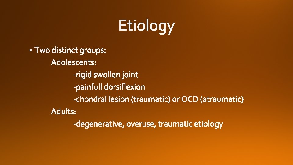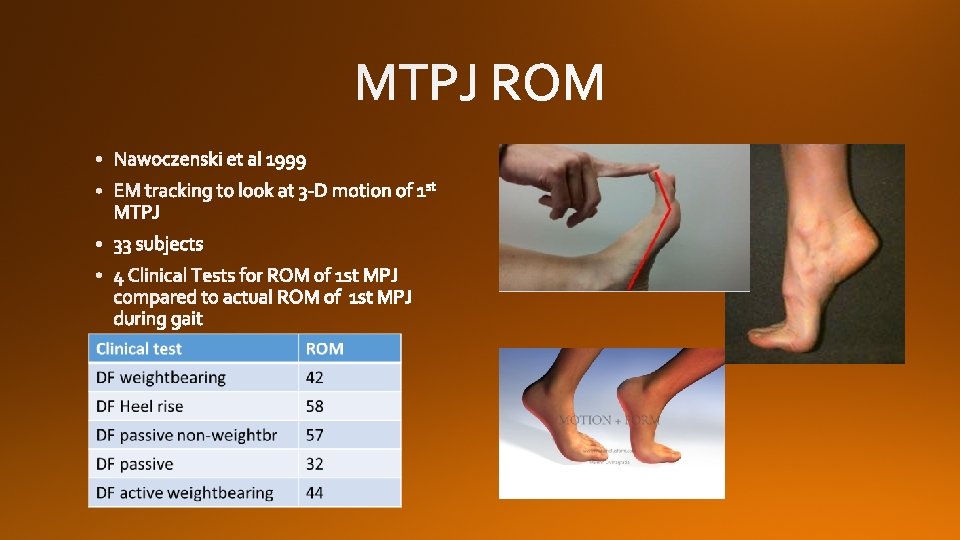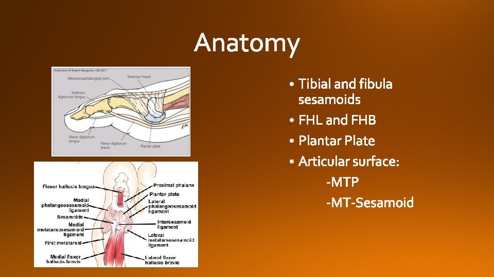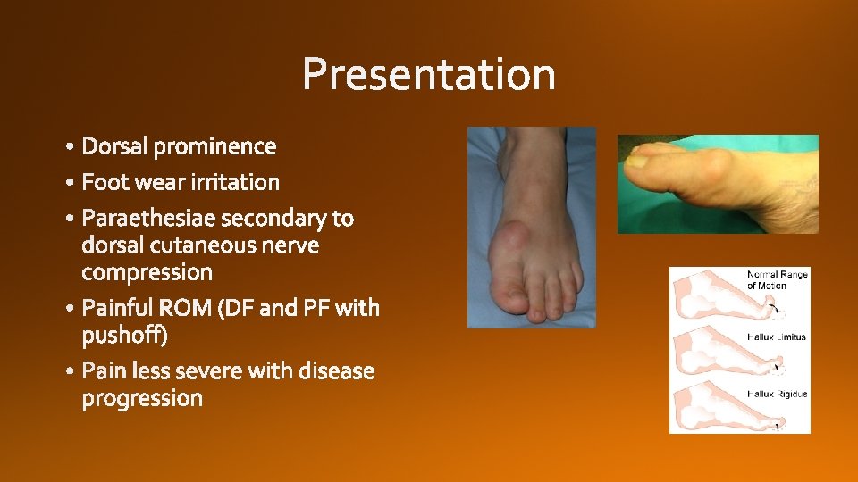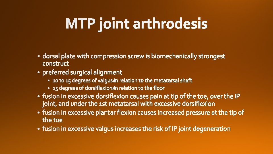 Procedure Indication Notes Joint debridement and synovectomy acute osteochondral or chondral defects Dorsal cheilectomy Pain with dorsiflexion Shoe wear irritation Pain in mid ROM contraindicated Obtain 70 -90% DF intraop. Dorsal closing wedge osteotomy of the proximal phalanx Runners with reduced dorsiflexion Failure of cheilectomy Decreases plantarflexion arc of motion Keller Procedure (resection arthroplasty) Elderly, low demand Significant joint degeneration Risk of hyperextension Weakness with pushoff Transfer metatarsalgia MTP arthroplasty Controversial Osteolysis and synovitis lead to Poor long term results with silicone joint destruction and pain implants Failed arthroplasty, transfer metatarsalgia MTP joint arthrodesis Significant joint arthritis (3 and 4) High fusion rate (70 -100%) 15% IPJ degeneration
