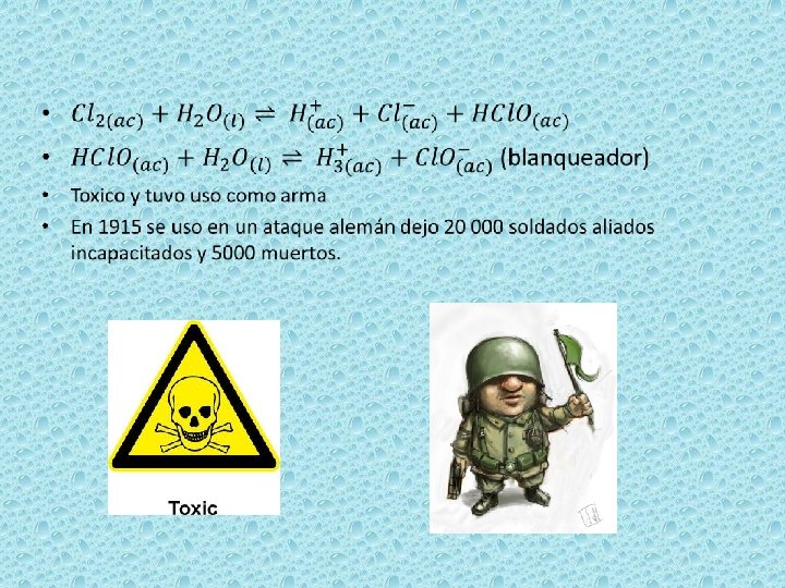 Reacciones. Con el hidrogeno reacciona con explosión incluso a bajas temperaturas, al igual reacciona violentamente con la mayoría de los metales: por ejemplo: Cl 2(g) + F 2(g) 2 Cl. F(g) Br 2(l) + 5 F 2(g) 2 Br. F 5(l) Descompone violentamente el 2 F 2(g) agua con formación de HF desprendiendo oxigeno y ozono 3 F 2(g) + 2 H 2 O(l) O 2(O 3(gg) + 4 HF(aq) + 3 H 2 O(l) ) + 6 HF(ag) El flúor en el cuerpo El flúor es un elemento muy tóxico y reactivo, este gas en elevadas concentraciones puede causar la muerte (Muy corrosivo). Muchos de sus compuestos, en especial los inorgánicos, son también tóxicos y pueden causar quemaduras severas y profundas. aunque también El flúor es esencial para mantener la solidez de nuestros huesos. El flúor también nos puede proteger del decaimiento dental.