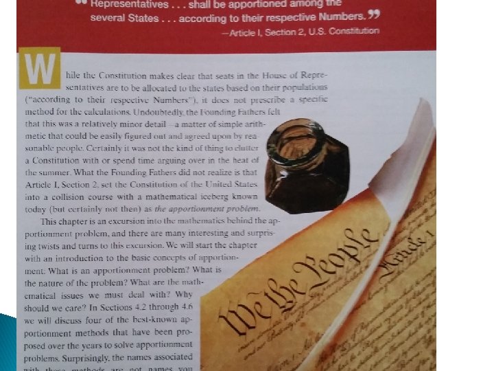 Hamilton and Jefferson Methods of Apportionment Txt: 4. 1 -4. 2 & SOL: DM. 9 (you can use notecards for your unit test…. only formulas are permitted- no examples Classwork: Please read p. 122 -123 in text p. 144 (1, 19 a, 23) Homework (Day 14): p. 144 (2, 12, 20 b, 24)