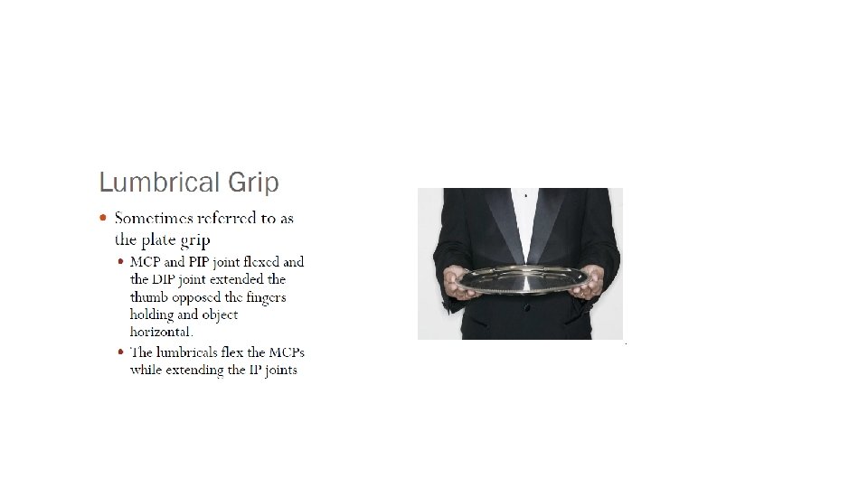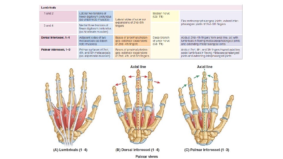 Lumbrical Muscles • They are 4 slender muscles arise from tendons of flexor digitorum profundus • They put the hand in writing position: - Flexion of metacarpo-phalangeal joints - Extension of interphalngeal joints