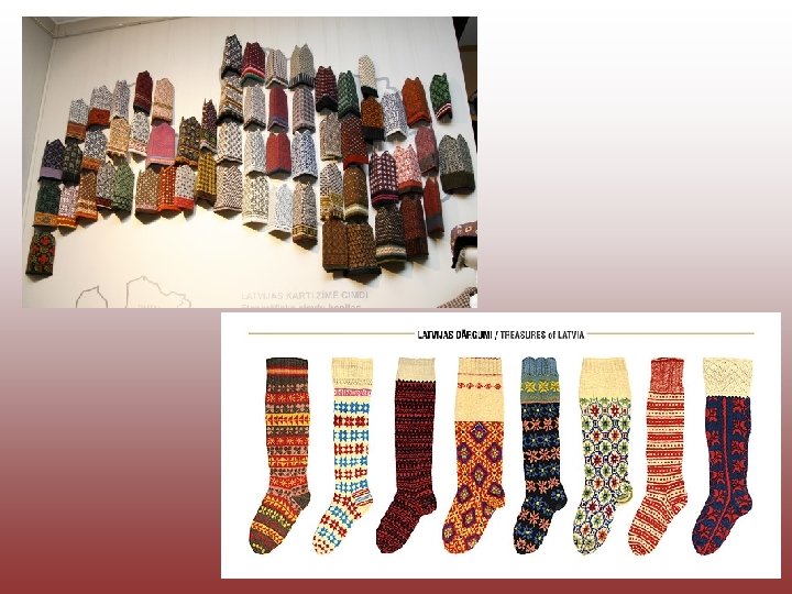 Knitting • Gaining inspiration from the bright patterns in the gloves and socks of our ancestors, craftswomen today create collec tions which preserve marked regional differences. Hand knit ted gloves and socks are still the most traditional textiles, and one of the most esteemed gifts.