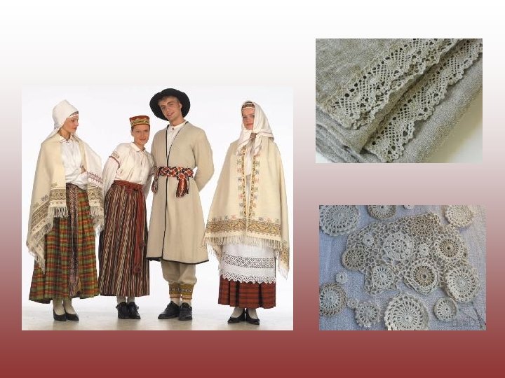 Lacework • Making lace has again become popular in Latvia. Knitters in folk art studios make lace using a variety of techniques. The main emphasis is placed on the pro duction of ethnographic samples folk costumes, edging for towels and other details.