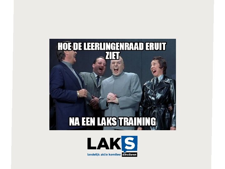 Wat we vandaag gaan doen: • Twee groepen: basistraining en Medezeggenschap voor gevorderden • Samenwerken in groepen • ‘De beste school van Nederland’ • Wat is het LAKS? • Debat en frisdrankborrel