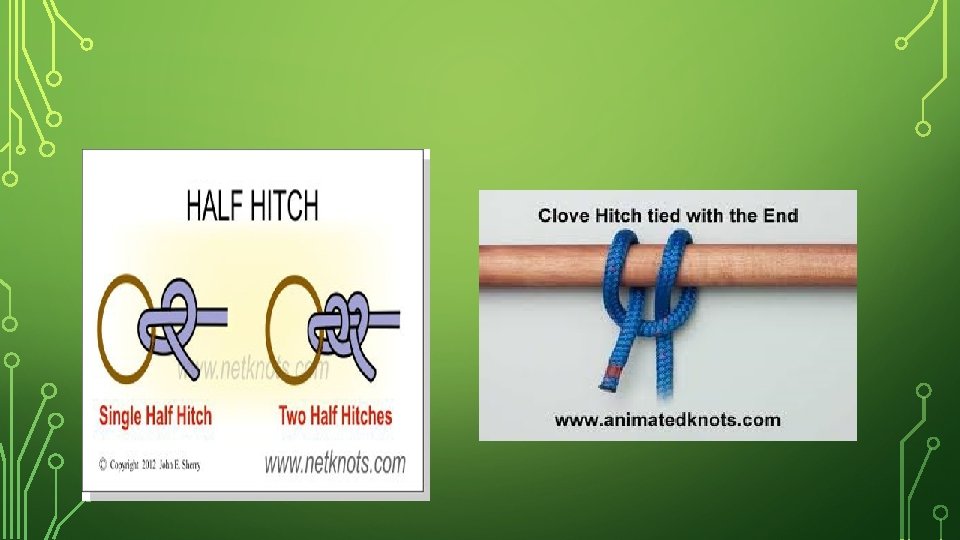 THE VETERINARY ASSISTANT NEEDS TO BE FAMILIAR WITH A VARIETY OF KNOTS. DIFFERENT KNOTS AND HITCHES HAVE SPECIFIC PURPOSE. KNOTS ATTACH ROPE TO THE ANIMAL AS WELL AS STATIONARY OBJECTS.