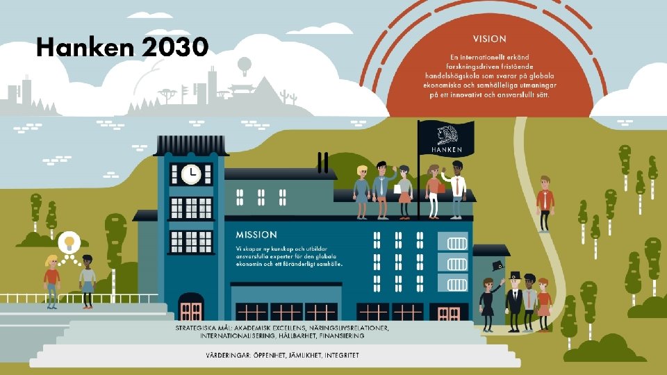 Om Hanken • Grundades 1909 • Universitetsstatus 1927 • Rätt att utbilda kandidater, magistrar och doktorer i ekonomi • Enheten i Vasa grundades 1980 • Omsättning 23 M€ (2019) • Balansomslutning 142 M€ (2019) • Internationella ackrediteringar: EQUIS, AACSB och AMBA • Internationella rankings: Financial Times och U-multirank