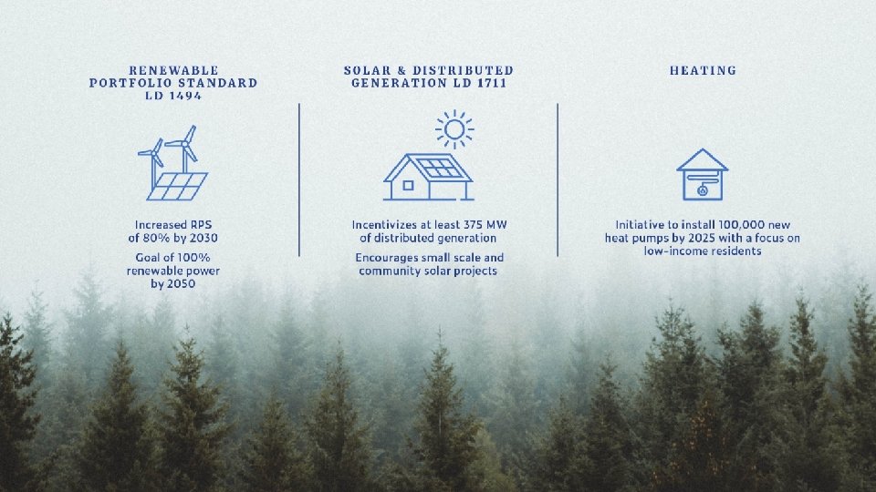 Reduce Maine’s Greenhouse Gas Emissions Bring the Future of Transportation to Maine Increase electric vehicle use Reduce emissions from current gas and diesel engines Reduce Vehicle Miles Traveled (VMT) Explore funding options for transportation needs & emissions reductions Modernize Maine's Buildings Improve the design and construction of new buildings and improve the efficiency of existing buildings Promote climate-friendly building products Transition to cleaner heating and cooling systems Institute a Renewable Fuel Standard “Lead by Example” at state and local level Reduce Carbon Emissions in Maine’s Energy and Industrial Sectors Ensure adequate affordable clean energy supply Initiate a stakeholder process to modernize Maine’s electric grid Accelerate the decarbonization of industrial use and processes Encourage highly efficient Combined Heat and Power facilities Develop financing options to meet clean energy and emission reduction targets