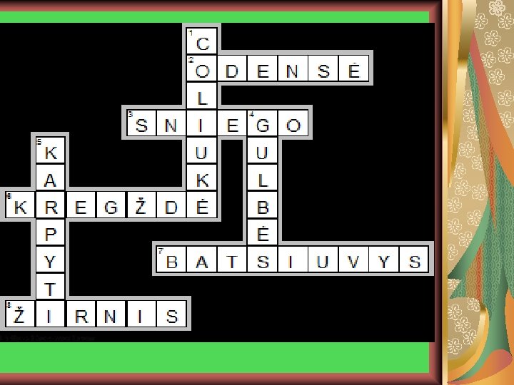Horizontaliai 2. Miestas, kuriame gimė rašytojas H. K. Andersenas 3. H. K. Anderseno pasaka ". . . . karalienė" 6. Paukštis, išgelbėjęs Coliukę 7. Kas buvo H. K. Anderseno tėvas? 8. Kas kliudė karalaitei miegoti? Vertikaliai 1. Pasakos veikėja, atsiradusi iš gėlės žiedo 4. H. K. Anderseno pasaka "Laukinės. . . . " 5. Mėgstamas rašytojo užsiėmimas