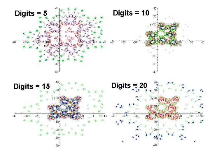 „Beispiel für Computerzahlen“ Iterativ erzeugte Punkt-Folge (nach U. Kulisch, TU KA) Pn(xn/yn), n 0 mit P 0(0/0) und Berechnung der Folgenglieder mit MAPLE Rechengenauigkeit: Digits = m (m = 5, 10, 15, 20), 2000 Folgenglieder, jeweils 500 Punkten in schwarz, rot, grün und blau. Zusammenhang mit „Chaos-Bildern“!